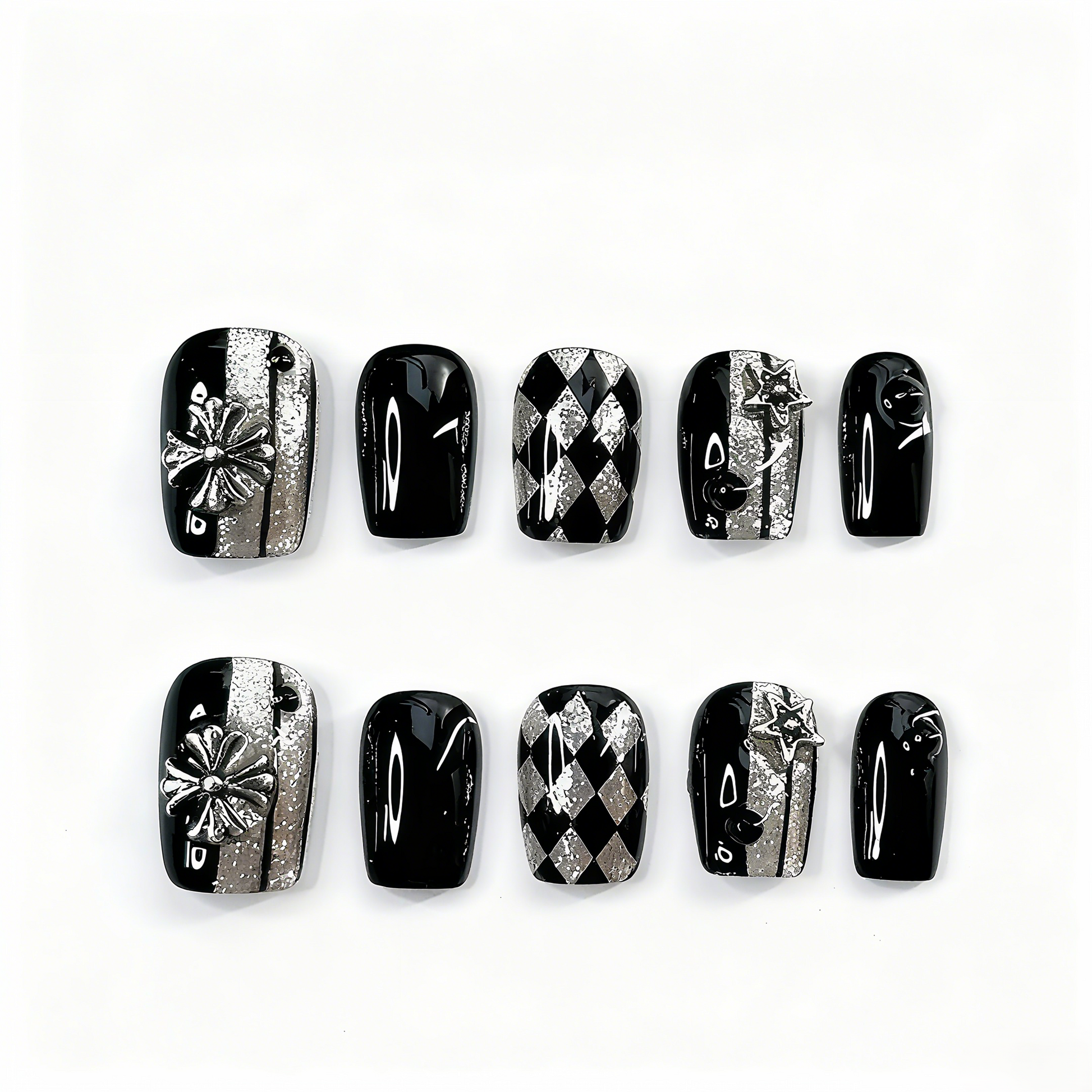 Nocturne Harlequin — a black–silver gothic statement from the Velvet Noir capsule. Hand-detailed harlequin diamonds, baroque metal blossoms and moon-star accents shimmer over a deep gloss black, balanced with argent foils for a quiet, dark-luxe finish.